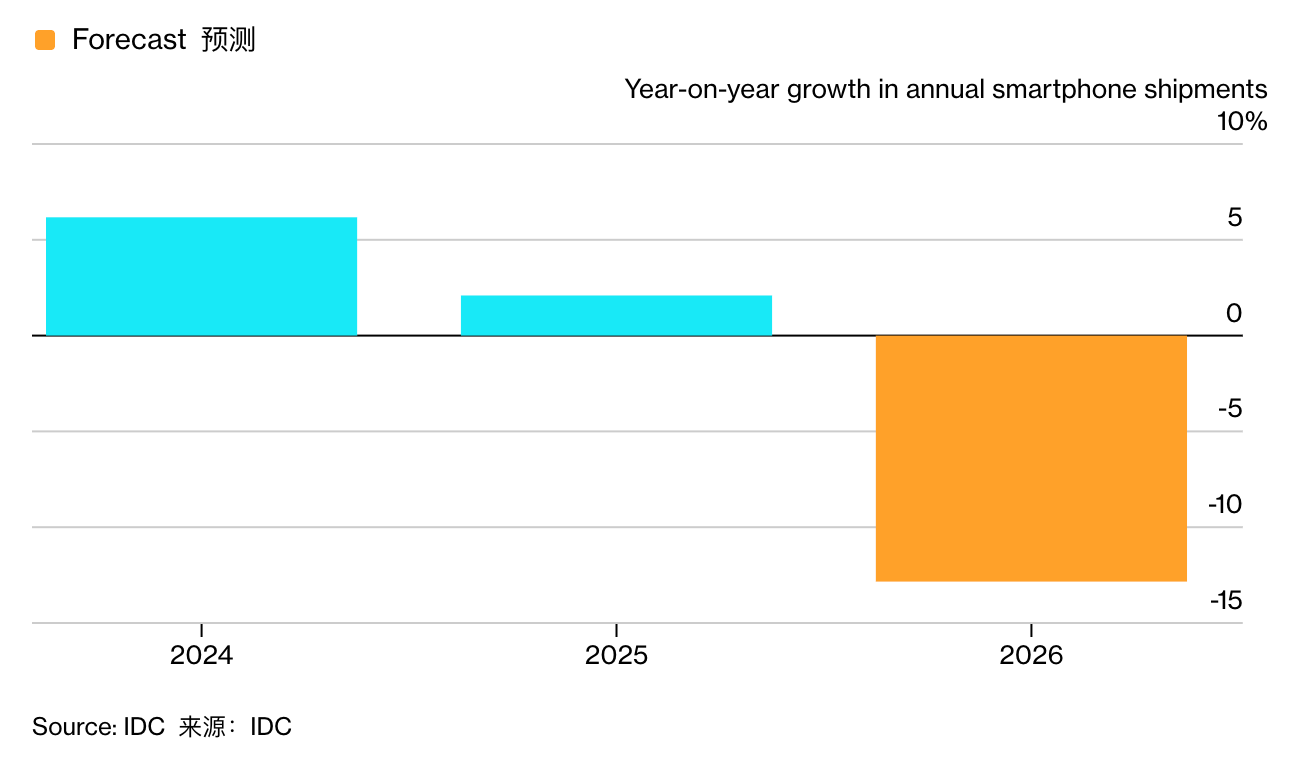 据彭博社援引机构 IDC 消息,受存储芯片供应危机的严重影响,2026 年全球智能手机出货量预计将大幅萎缩 12.9%。