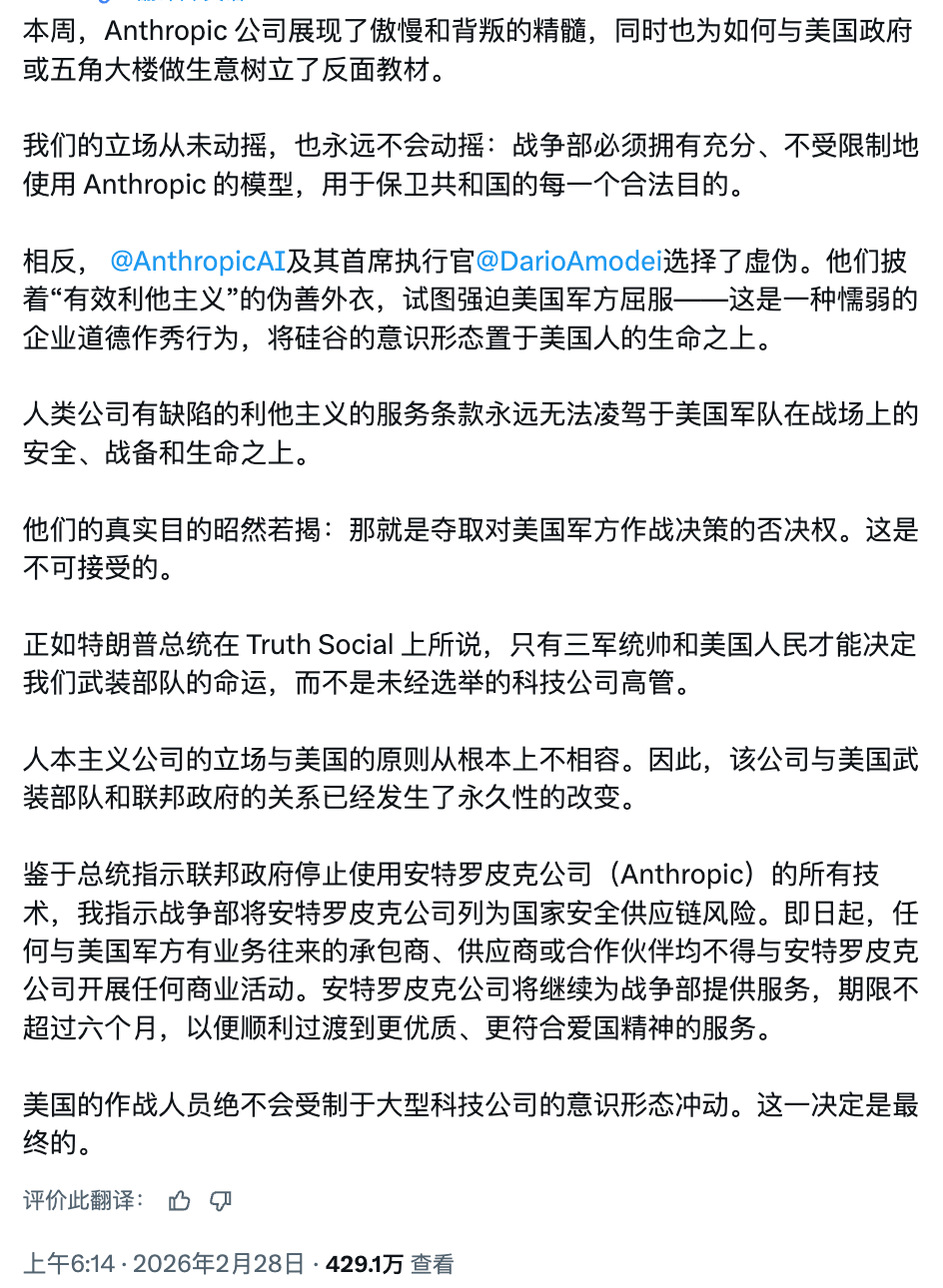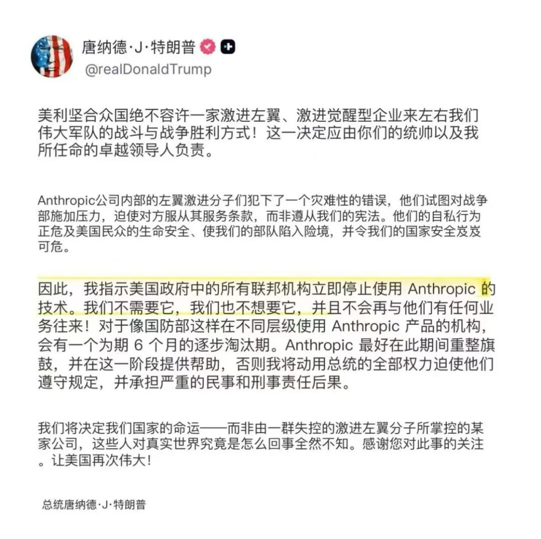 白宫官方账号于北京时间 2 月 28 日凌晨转发特朗普声明(发布于特朗普自己的媒体 Truth Social),宣布所有联邦机构立即停用 Anthropic 技术,给予六个月过渡期