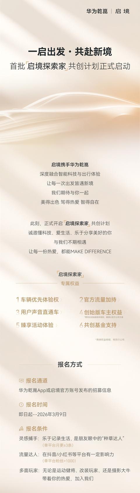IT之家 2 月 28 日消息,华为乾崑 | 启境汽车今日宣布,首批「启境探索家」共创计划正式启动,提供 6 项专属权益:
