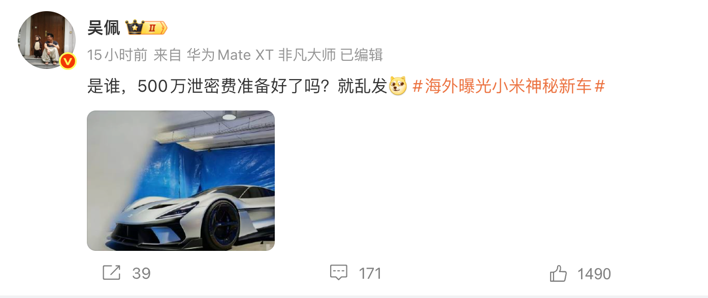 随后,网上出现了疑似小米超跑的实车图片。在博主 “吴佩”的评论区下,顺为资本投资合伙人胡峥楠2月27日晚回应称:网友作品啦!别当真了。实车帅多了,超出大家认知,请等待,好菜不怕晚。