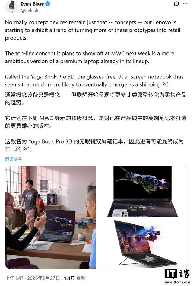 IT之家 2 月 28 日消息,消息源 @Evleaks 今天(2 月 28 日)在 X 平台发布推文,爆料称 3 月初在巴塞罗那举行的世界移动通信大会(MWC)上,联想将展示概念产品 Yoga Book Pro 3D,并有可能商业化落地。