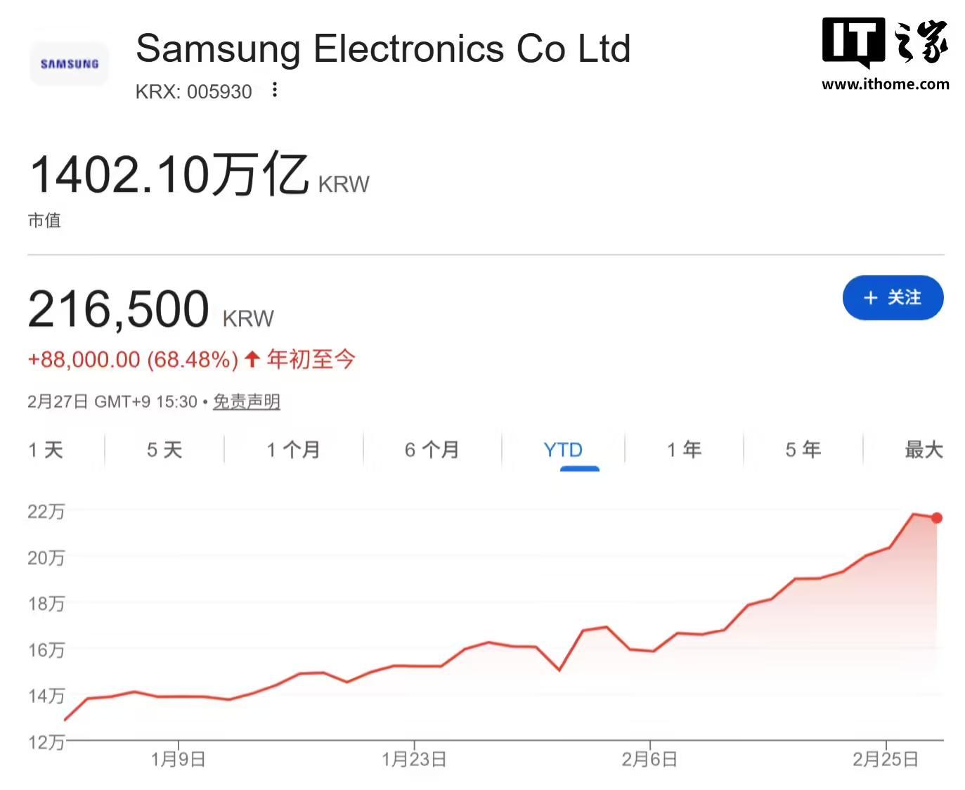 该公司的股价表现堪称一次奇迹反弹,其股价曾于 2024 年 11 月一度跌至近四年来的最低点,一度跌至 51700 韩元。IT之家发稿前,查询三星电子股价,目前已达到 216500 韩元,市值为 1402.10 万亿韩元。