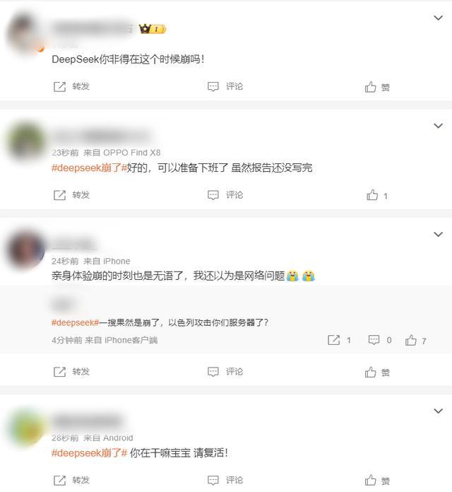 小雷试着反复刷新好几次,页面还是停留在“服务器繁忙”的提示。这下才反应过来是真的崩了。翻了翻微博评论区,发现不少正在用DeepSeek的网友被这波突发状况打乱了节奏,一页博文都是吐槽的文案。