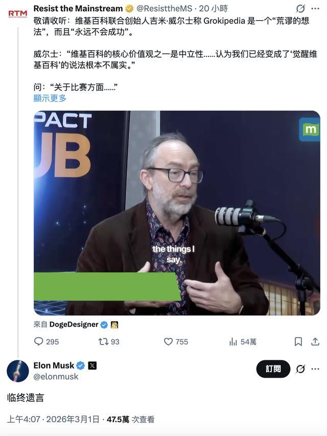 IT之家 3 月 1 日消息,维基百科创始人 Jimmy Wales 最近在访谈中认为,马斯克的 Grokipedia 只是“滑稽的模仿品”,荒谬至极、注定失败。