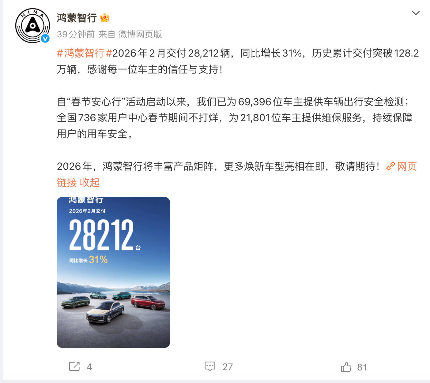 鸿蒙智行2月交付28212辆,同比增长31% 凤凰网科技讯 3月2日,鸿蒙智行宣布:2026年2交付28212辆,同比增长31%,历史累计交付突破128.2万辆。 官方同时宣布,自今年“春节安心行”活动启动以来,已为69396位车主提供车辆出行安全检测;全国736家用户中心春节期间不打烊,为21801位车主提供维保服务,持续保障用户的用车安全。 今年1月,鸿蒙智行官宣累计交付57915台,同比增长65.6%。2025全年累计交付589107台,年同比增长32%;2025年12月单月交付89611台,连续三个月创月度交付历史新高。 Published by 风君子 独自遨游何稽首 揭天掀地慰生平 View all posts by 风君子