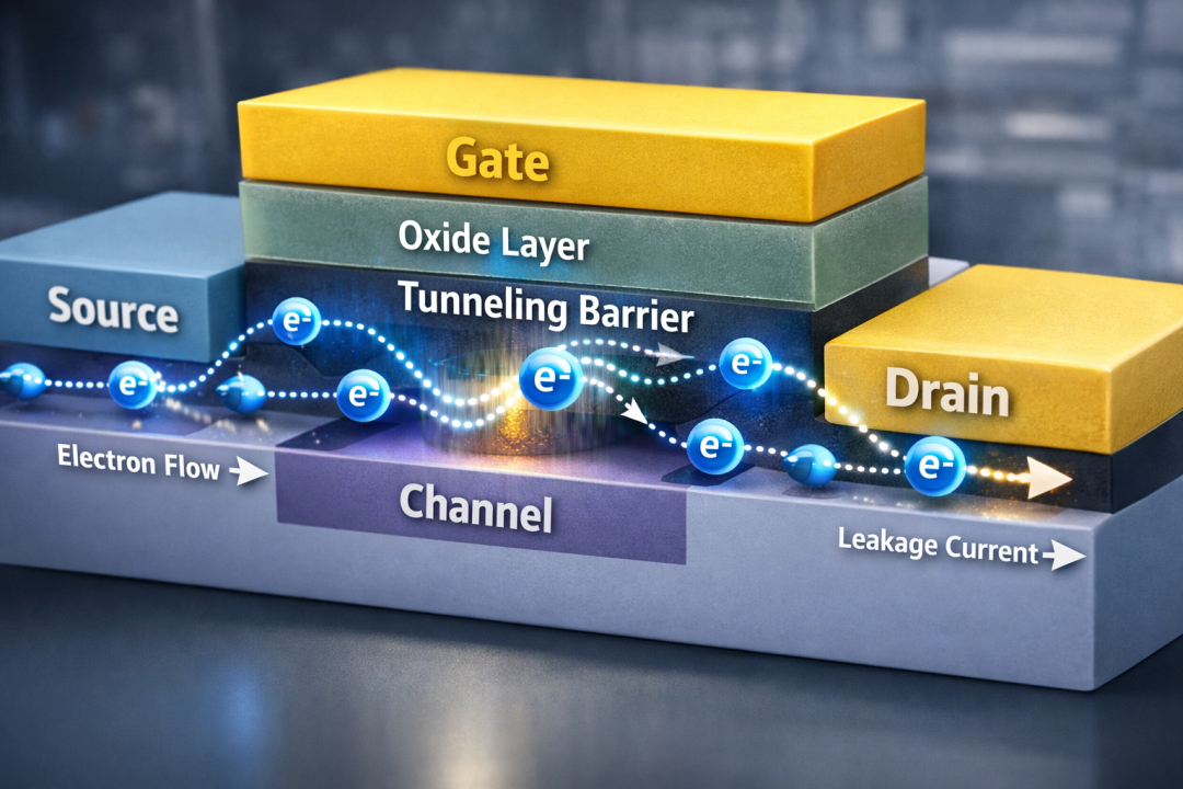 晶体管通过栅极 ( 门 )来控制电流的开与关 ( 1 和 0 )。但问题是当晶体管小到一定程度的时候,电子就开始胡来了,即便是门关上了,还是会有电子偷溜过去。