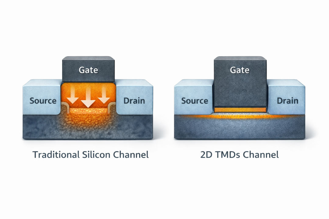 而以硫化钼 MoS₂、硒化钨 WSe₂ 为代表的 2D TMDs 材料,厚度只有几层原子厚,栅极控制起电子就手拿把掐。
