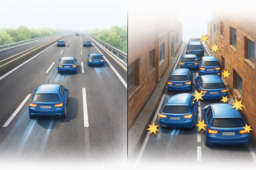 还是用经典的高速公路例子给大家解释,原本宽阔( 导线粗 )的路上六七辆车( 电子 ) 随便跑,但一旦路变窄( 导线细 )了,车( 电子 ) 就跑不动了。