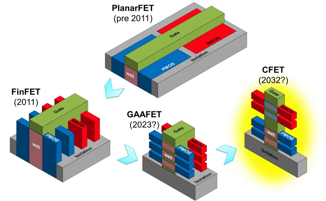 但在最近几年的 IEDM 上,一个被越来越频繁提起的新方向就是台积电等巨头反复押注的 CFET(互补场效应晶体管)。