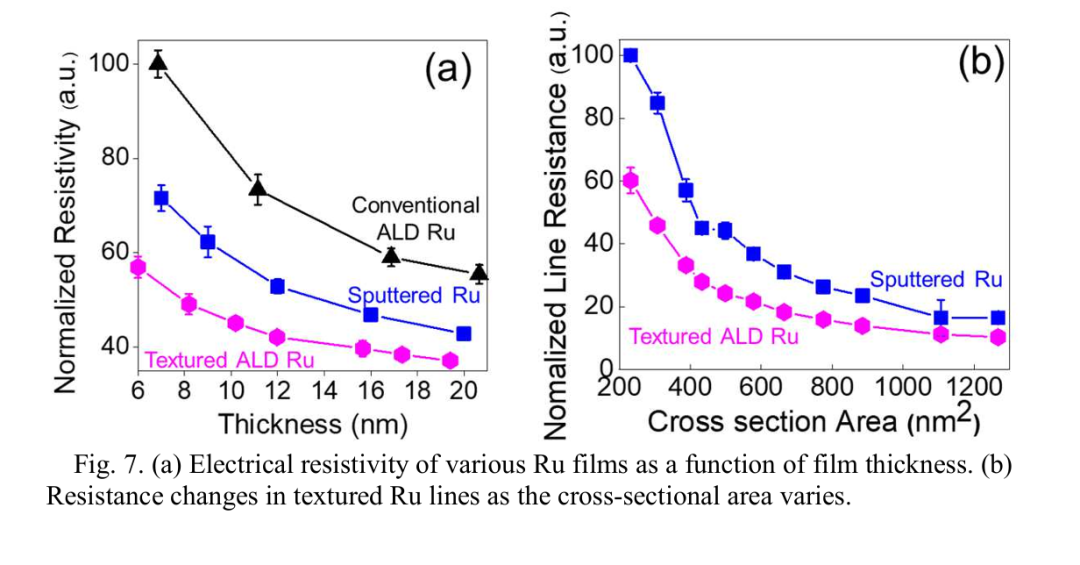 这不在 IEDM 2025 会上,来自三星的实验结果表明,在横截面积只有 300 nm² 的超细互连线中,采用这种工艺制造的钌线相比溅射工艺的钌线电阻降低了 46%。