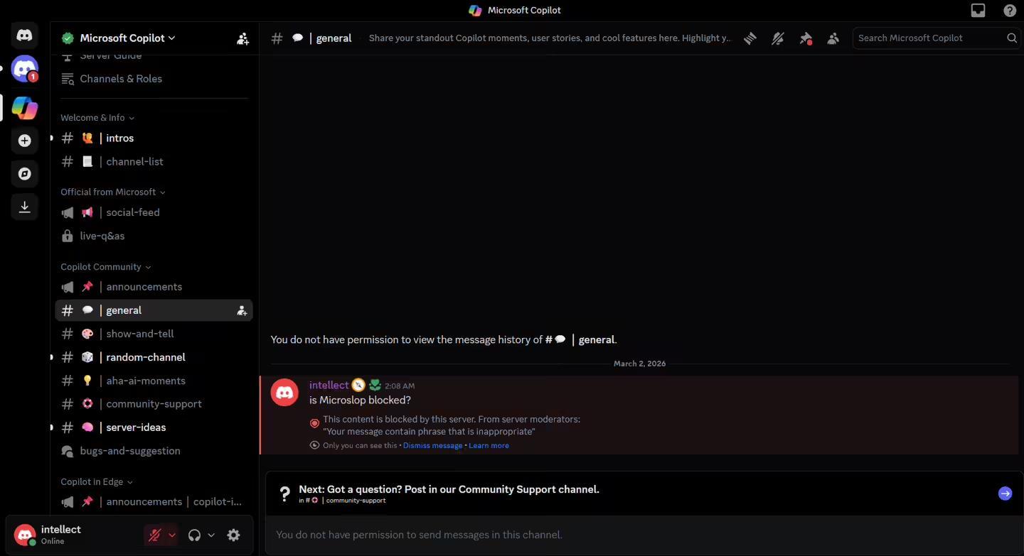 Microsoft Copilot 官方 Discord 服务器已对“Microslop”设立关键词过滤。用户发送包含该词的消息时,内容不会公开显示,系统会提示消息因包含不当词语而被拦截。