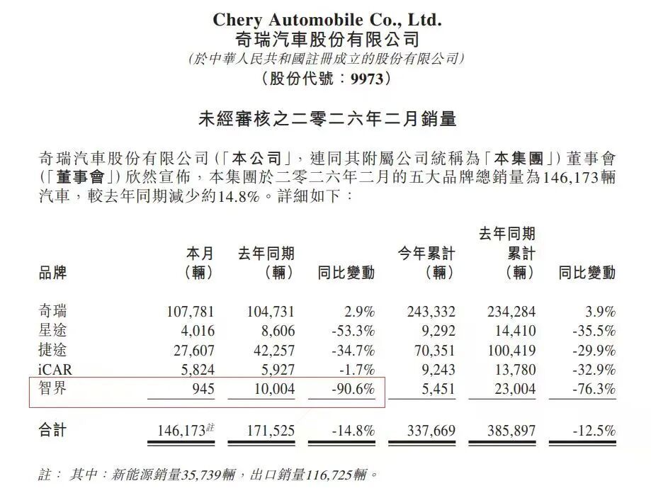 智界汽车2月销量不足千辆 奇瑞汽车发布的最新产销快报显示,智界汽车今年2月销量945辆,较去年同期的10004辆下跌90.6%。根据鸿蒙智行今日发布的数据,“五界”2月交付28212辆,同比增长31%。 Published by 风君子 独自遨游何稽首 揭天掀地慰生平 View all posts by 风君子