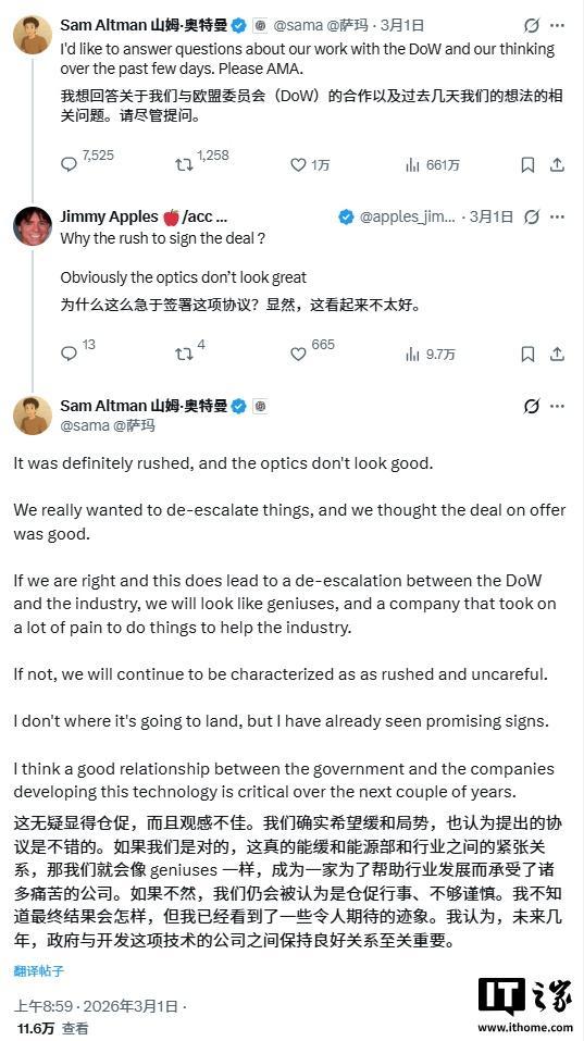 IT之家 3 月 2 日消息,OpenAI 首席执行官萨姆 · 奥尔特曼本人也承认,公司与美国国防部的协议“绝对是仓促敲定的”,而且“外界观感并不好”。