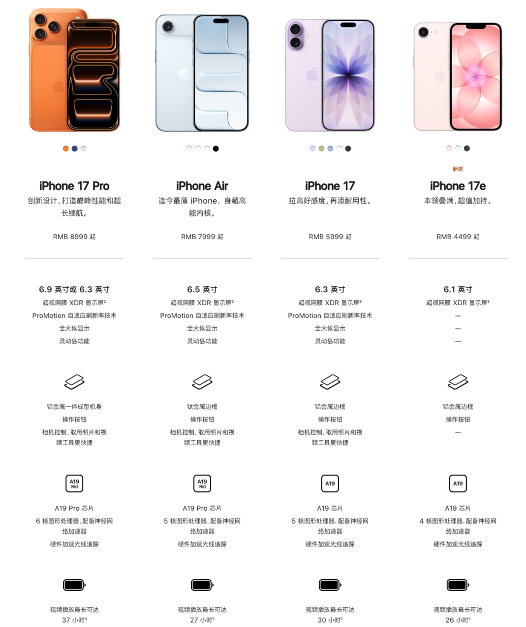 在 iPhone 17 系列续航都有显著增长的情况下,iPhone 17e 的续航居然原地踏步,官方宣称能达到 26 小时的视频播放时长,和上一代比没有不同,低于 iPhone 17 的 30 小时,这跟屏幕不支持自适应刷新率脱不开干系。