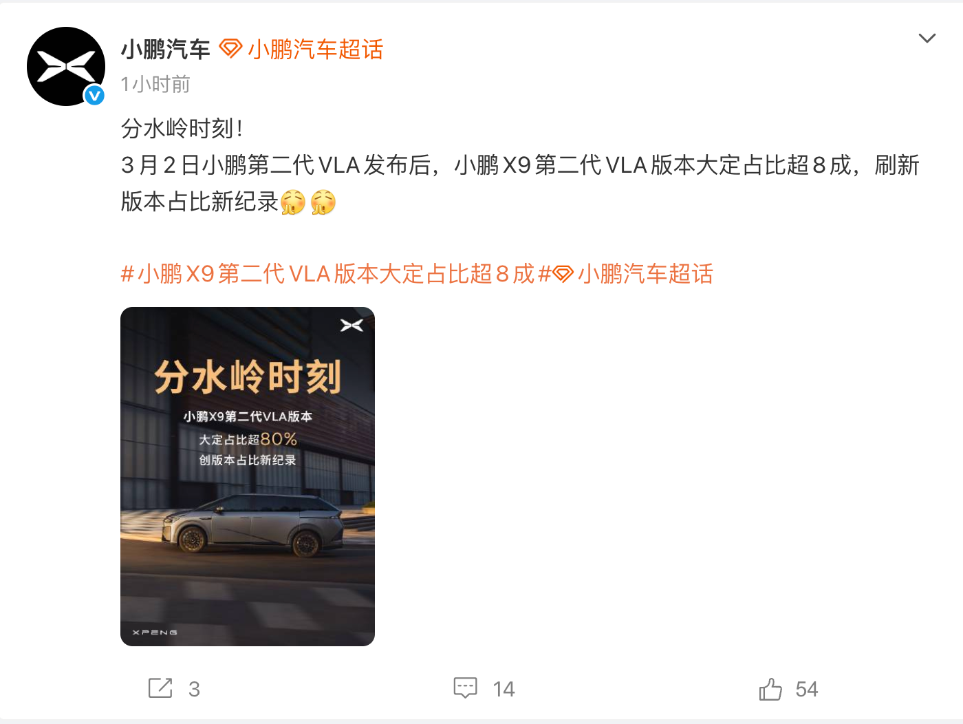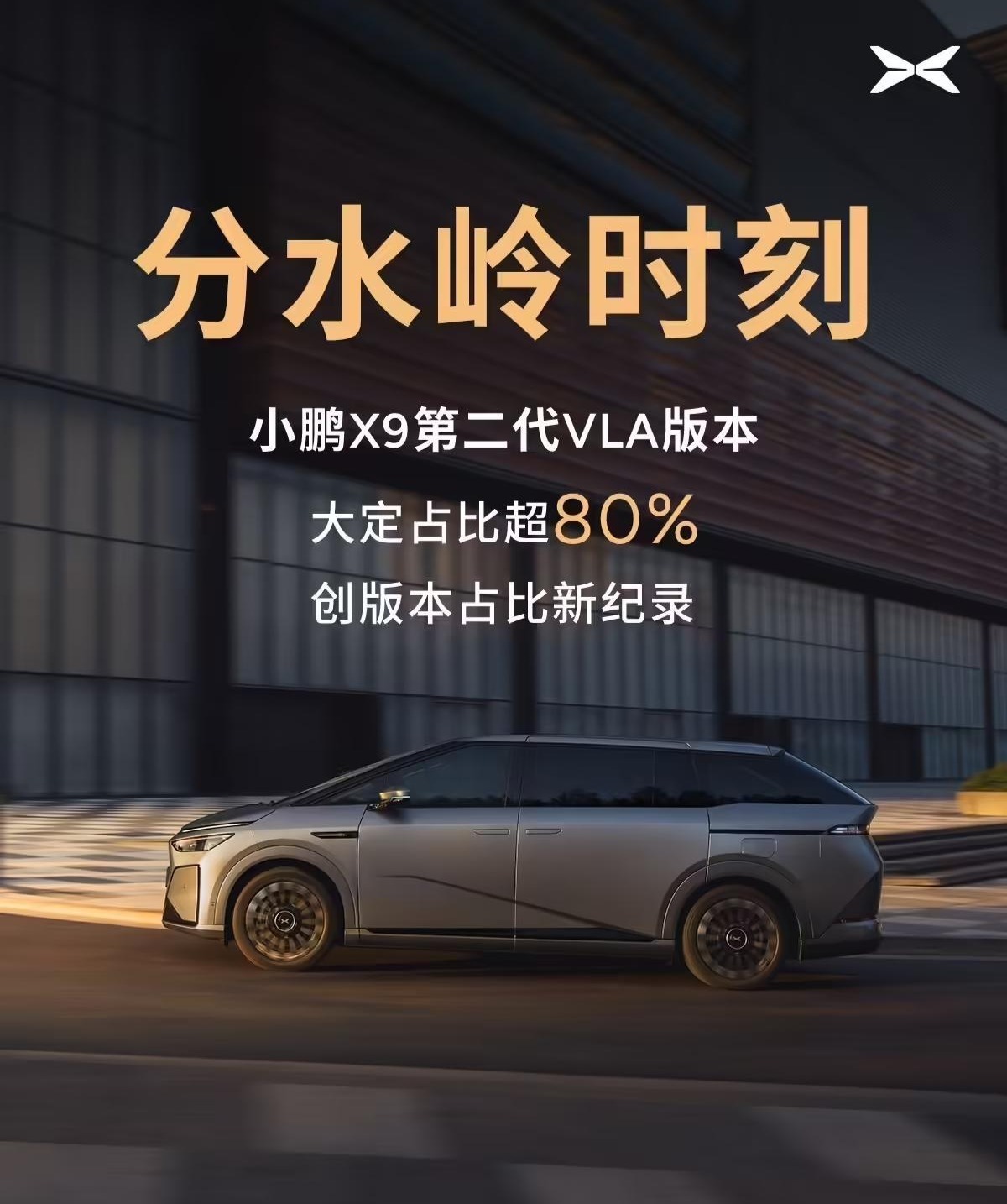 凤凰网科技讯 3月3日,小鹏汽车官方宣布,小鹏X9第二代VLA版本大定占比超8成,创版本占比新纪录。官方称之为“分水岭时刻”。
