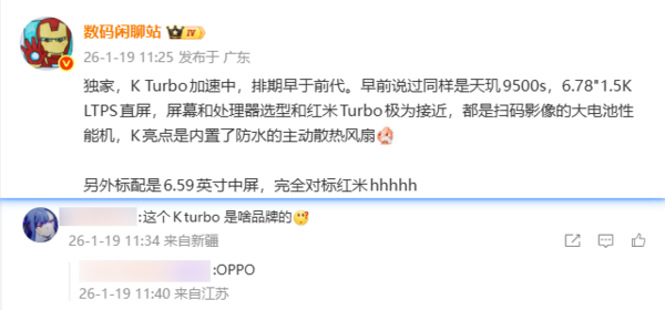 2026年1月,“数码闲聊站”又带来了新的消息:OPPO K15 Turbo系列将搭载联发科天玑9500s处理器,配备6.78英寸1.5K LTPS直屏。该机还将内置带有防水功能的主动散热风扇,这一设计有望提升手机在高负荷运行时的散热性能,保障手机的稳定性和流畅性。
