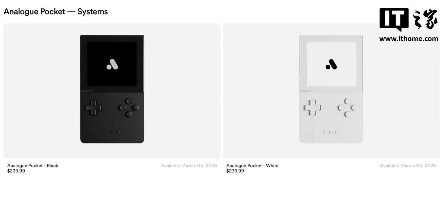 IT之家 3 月 3 日消息,Analogue 官方今天宣布 Pocket 掌机将于明天再次开启预订,预计 6 月开始发货,不过售价调整至 239 美元(IT之家注:现汇率约合 1650 元人民币),相比之前涨价 20 美元(现汇率约合 138.1 元人民币)。