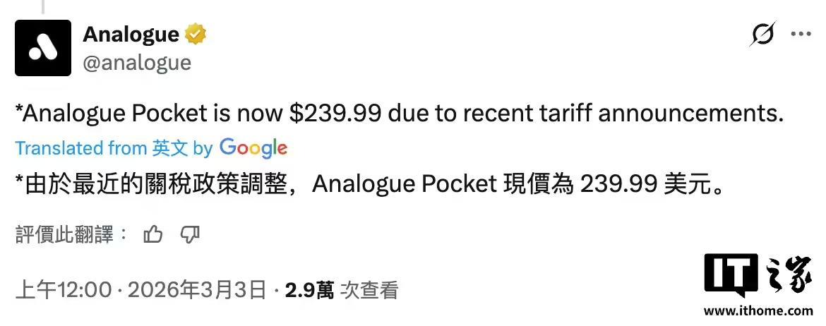 Analogue 官方今天在 X 平台表示,此次涨价主要是因为关税政策调整。