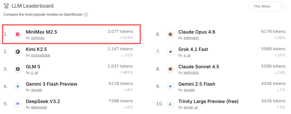 所以,M2.5 发布后,Token 消耗量出现指数级增长,仅发布首周调用量就暴涨至 3.07T Tokens,超过 Kimi K2.5、GLM-5 与 DeepSeek V3.2 三家总和。