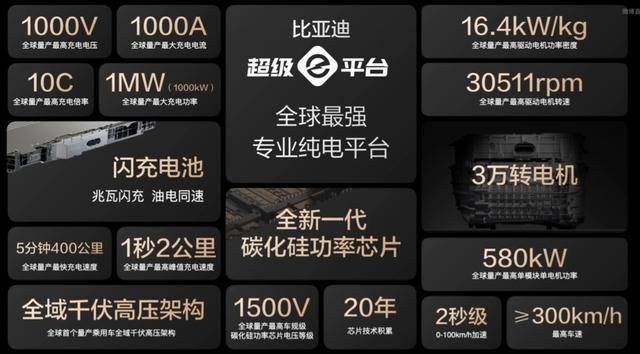 比亚迪还发布了闪充电池,具备超高电压 1000V、超大电流 1000A 及超大功率 1000kW ,可实现“兆瓦闪充”,拥有全球量产最高峰值充电速度 —— 一秒两公里。