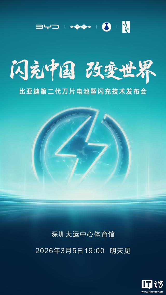 据IT之家今日早些时候报道,比亚迪第二代刀片电池暨闪充技术发布会定档 3 月 5 日 19:00 在深圳大运中心体育馆举行。仰望汽车今日也同步官宣,仰望 U7 2026 款将首搭第二代刀片电池,1006 公里超长纯电续航(CLTC)。