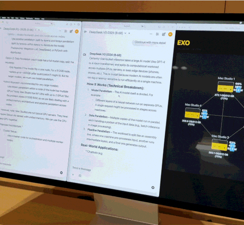 团队为这个 Mac 集群开发了调度平台 Exo V2,可以同时加载 2 个 DeepSeek 模型(V3+R1,8-bit 量化)。不但两个模型并行推理,研究人员甚至可以通过 QLoRA 技术来做一些本地微调工作,显著缩短了训练任务的用时。整套系统功耗控制在 400W 以内,运行时同样几乎没有风扇噪音。