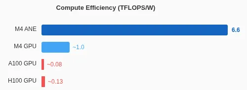 折算一下,A100 单卡的吞吐性能是 M4 ANE 的 50 倍,但 M4 ANE 的功耗性能却是 A100 的 80 倍。原作者在文章里写道:对于端侧推理,ANE 的性能是非常出色的。