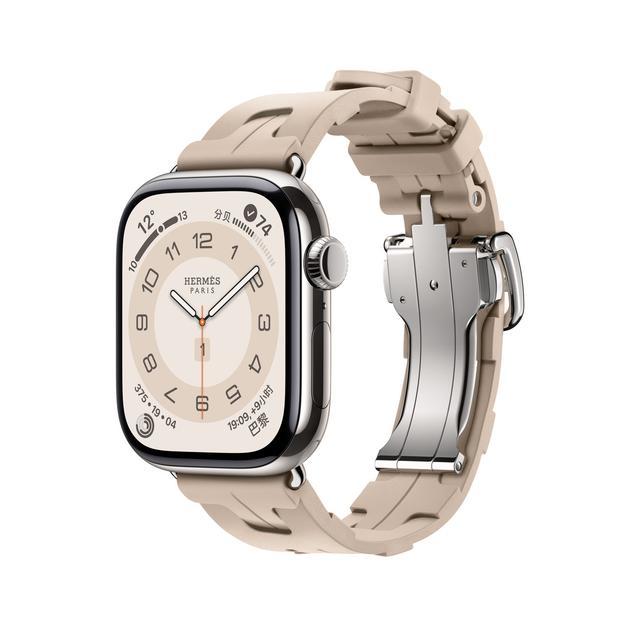 官方介绍为:“挥挥洒洒,扣合运动之美。Kilim 表带由柔软的防水橡胶模塑成型,并融入了“H”形结构设计。折叠扣一按即开,方便顺手。”