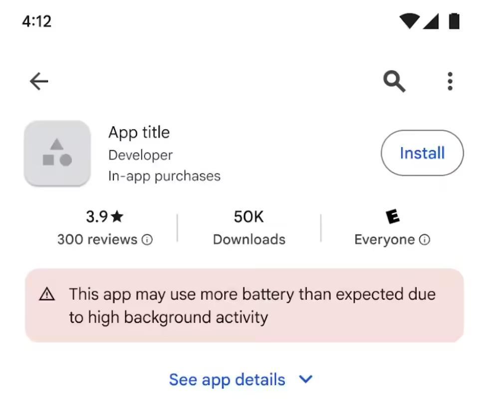 同时,此类耗电量较大的应用商店页面会出现醒目的红色警告,称相应应用“后台活动较多,电池消耗可能高于预期”,从而影响用户下载决策。