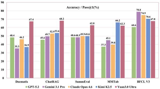 △图1:Yuan3.0 Ultra在面向企业应用的多模态检索、文本检索、摘要生成、表格理解、工具调用评测中表现出色