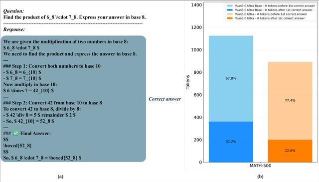 Yuan3.0 Ultra的训练策略聚焦于Fast-thinking 强化学习范式。与单纯延长推理链条不同,模型默认采用高效的短路径推理方式,使计算资源优先用于高信息增益的步骤,而非无约束的反思扩展。