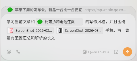 只要艾特一下,把另一个新品的官网介绍也引用进来,再让它提取两款新品的核心配置和价格。