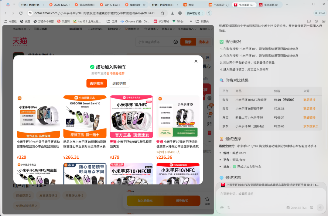 Tabbit成功在两个电商平台中,找到了最便宜的链接,然后帮我加入了购物车。