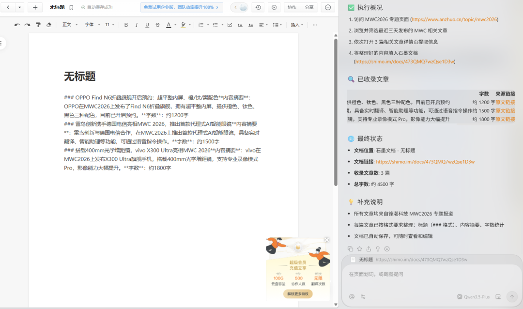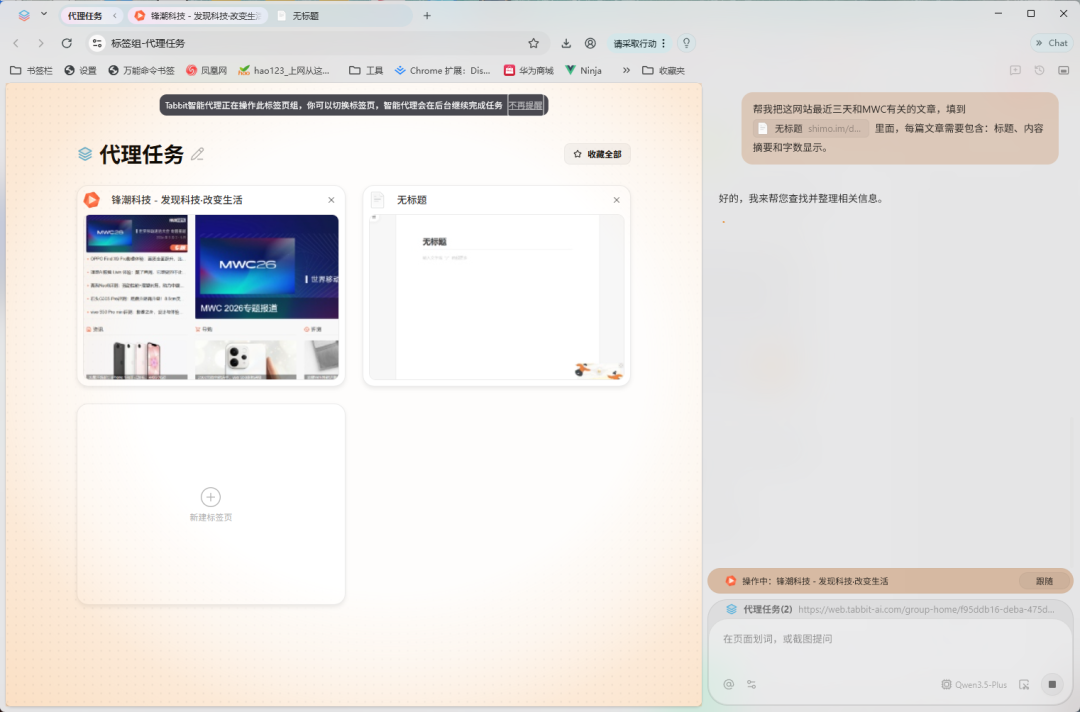 比如我想汇总锋潮科技官网,最近三天跟MWC有关的文章,于是就用「智能代理」模式提了这么个要求——