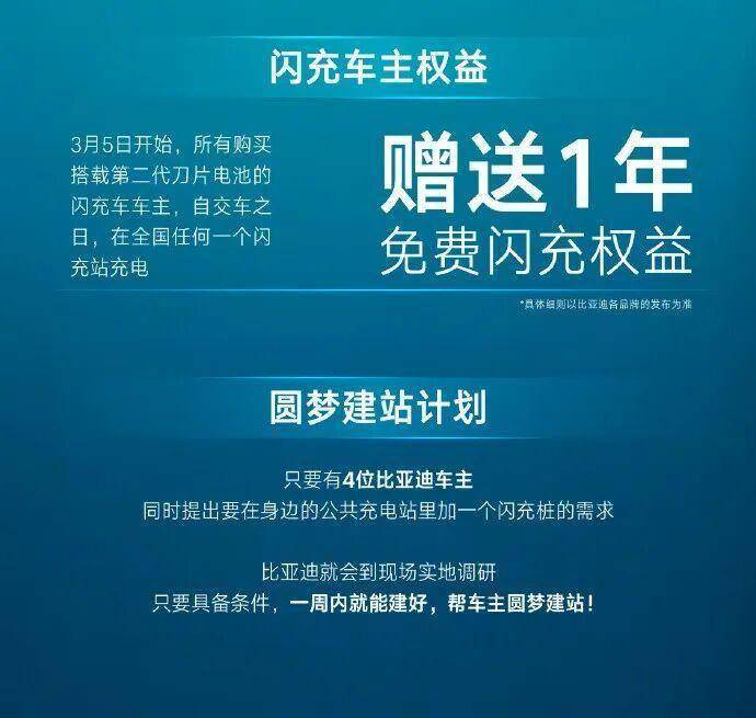 所有购买第二代刀片电池的闪充车主,从交车日开始算,送一年的免费闪充;
