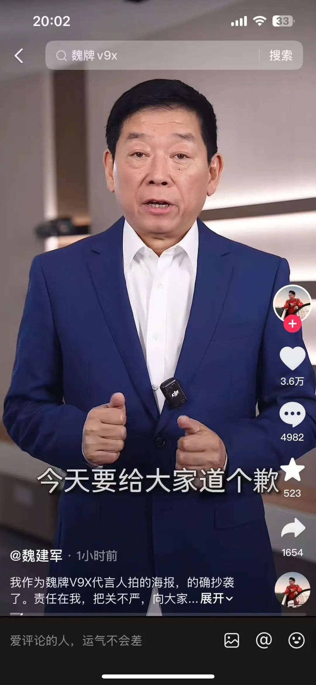 面对舆论质疑,魏建军并未选择回避,而是在3月6日晚间迅速通过个人社交平台发布道歉视频。他在视频中坦言,经过内部核查,魏牌V9X代言人海报确系抄袭,“不能有任何的辩解”,并向路虎品牌、原版海报创作者以及广大网友表达诚挚歉意。