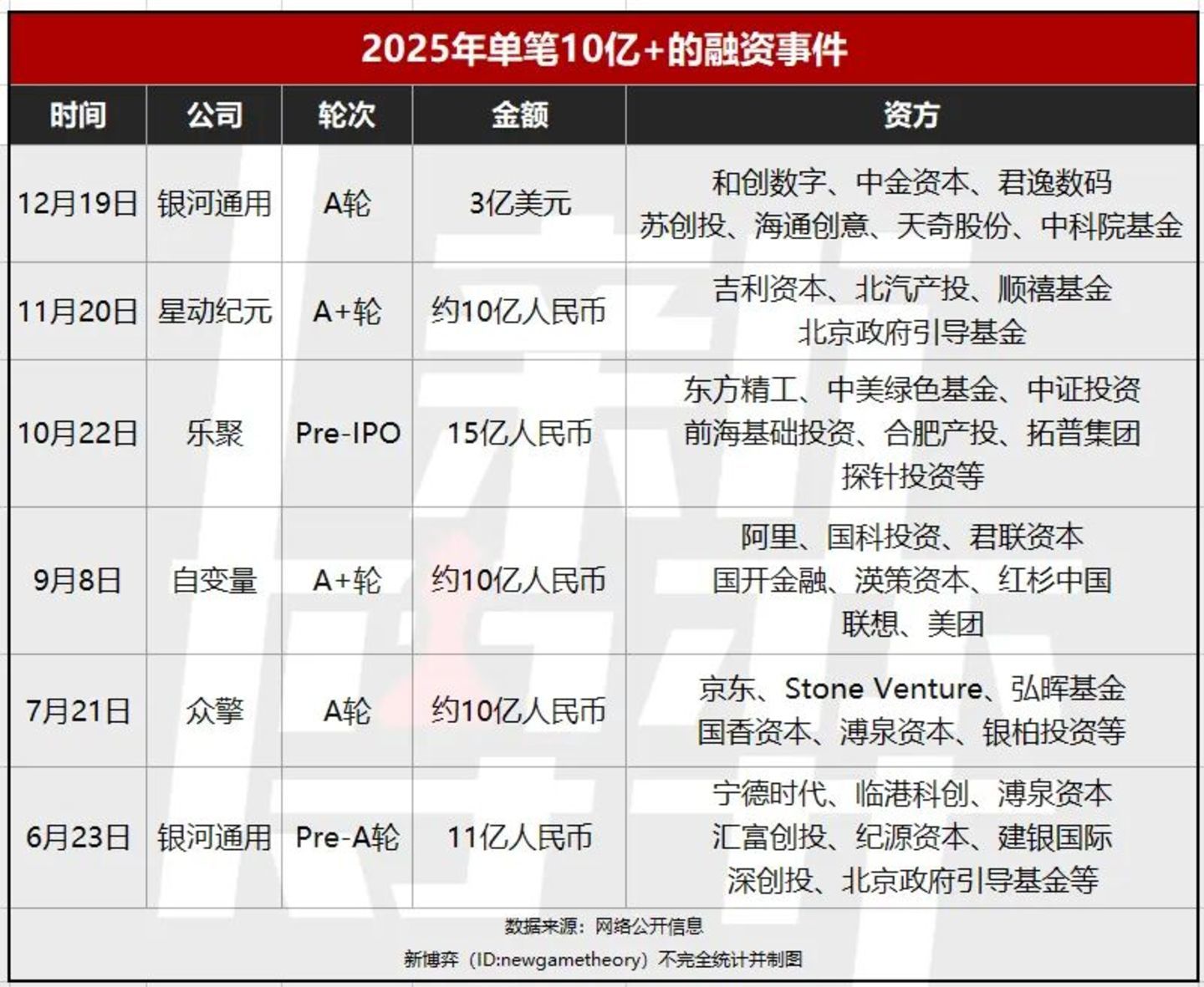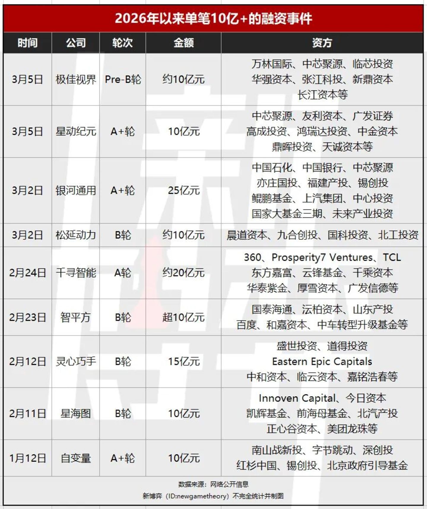 值得注意的是,具身智能领域融资愈发密集的同时,单笔融资金额也在走高。据新博弈不完全统计,仅2026年以来,具身智能领域已经出现9起单笔金额10亿及以上的融资,而在2025年全年,同规模融资为6起。