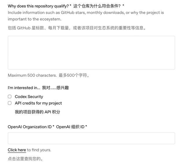 此外,本次资助计划没有 Star 数、月下载量等硬性指标,开发者只需要满足以下两个要求中的一个即可在 OpenAI 官网提交申请: