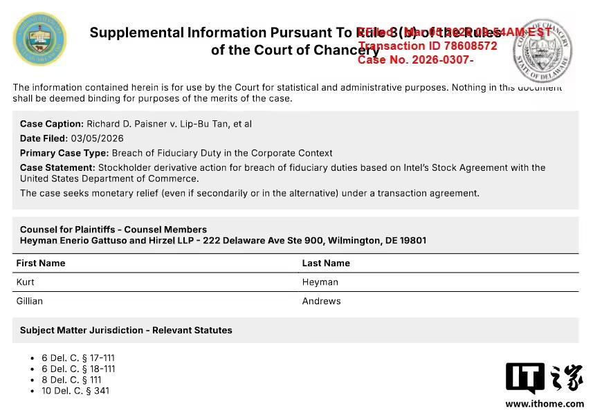该诉讼已向特拉华州衡平法院(Delaware’s Chancery Court)密封提交。根据案件备审表记录,这起股东诉讼还将商务部列为被告。该案件编号为 Paisner v. Tan,案卷号 Del. Ch., No. 2026-0307,诉状已于 3 月 5 日密封提交。