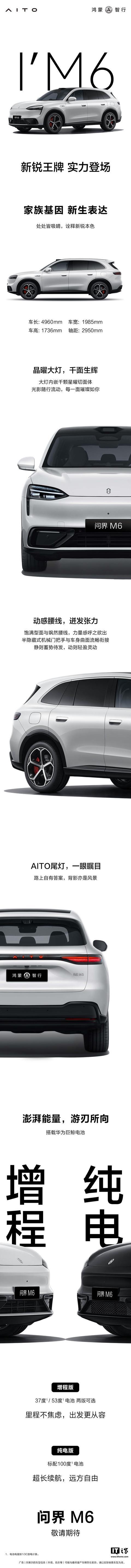工信部信息显示,问界 M6 增程版将提供三种纯电续航里程版本,分别为 180 公里、260 公里和 272 公里三种(测试工况未知),新车将会在今年春天正式发布。