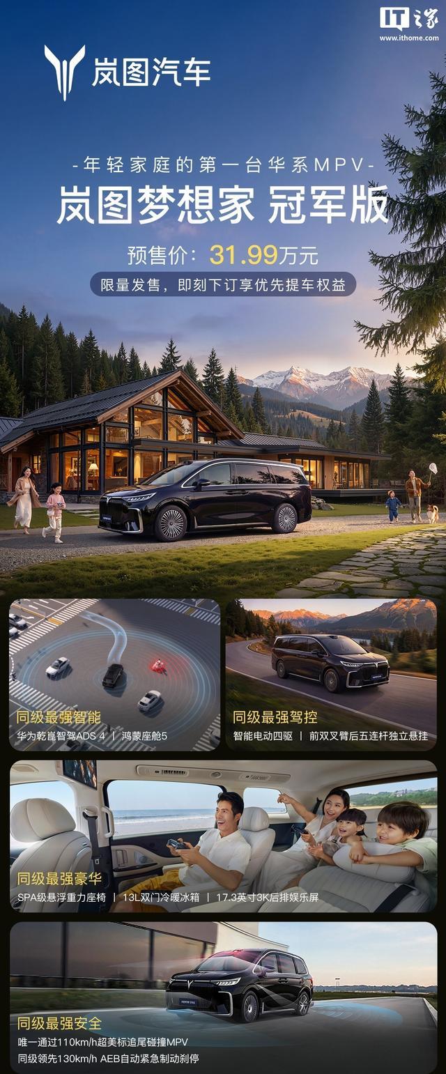 岚图梦想家冠军版MPV定档3月10日上市 预售价31.99万元 IT之家 3 月 8 日消息,据岚图汽车官方最新消息,岚图梦想家冠军版 MPV 将在 3 月 10 日上市,该车预售价 31.99 万元起。另外,岚图梦想家第 20 万辆车也将于 3 月 10 日正式下线。 据IT之家此前报道,本月初,岚图旗下高端新能源 MPV 梦想家限量推出冠军版车型。新车采用曜黑格栅设计,与玄英黑车身配色形成呼应,进一步强化整车气场与力量感,呈现出更具个性化的视觉效果。 核心配置方面,新车搭载华为乾崑智驾 ADS 4 系统及鸿蒙座舱 5,号称拥有百万级底盘体验和智能四驱。 Published by 风君子 独自遨游何稽首 揭天掀地慰生平 View all posts by 风君子