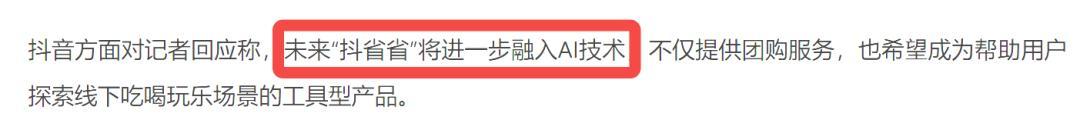 因为在上线抖省省的时候,官方特地出面放风:“未来,平台会进一步融入AI技术,让抖省省不仅是一个省时省心的团购APP,更成为陪伴用户探索吃喝玩乐线下场景、提升生活品质的贴心助手”。