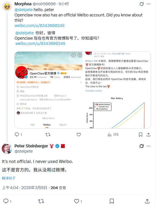 然而,针对这一情况,OpenClaw 项目创始人彼得 · 斯坦伯格(Peter Steinberger)于今日作出明确回应,否认该微博账号的官方性质。截至IT之家发稿,该微博仍显示为正常状态。