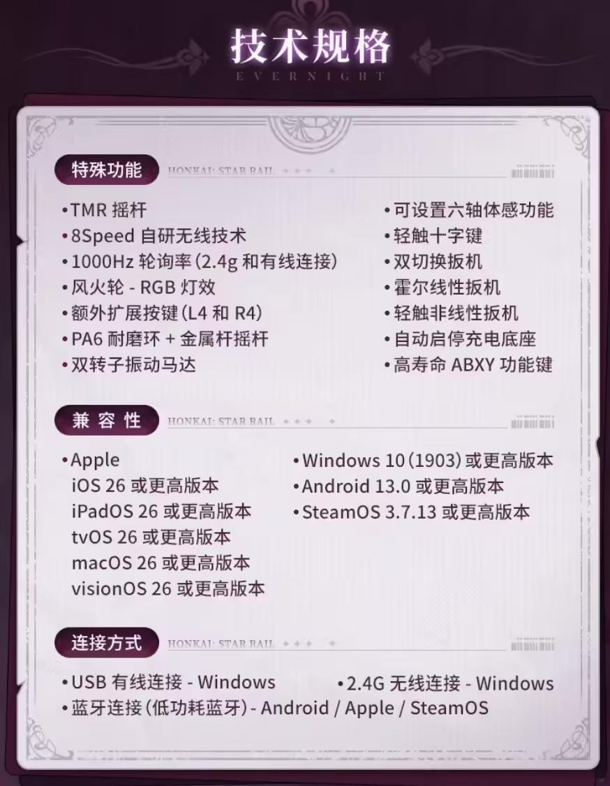 米哈游联合八位堂推出《崩坏:星穹铁道》游戏联名长夜月手柄,499 元 IT之家 3 月 9 日消息,米哈游现已联合八位堂推出《崩坏:星穹铁道》长夜月手柄,定价为 499 元,将于 5 月发货。收录包含定制手柄、充电底座、数据线、无线接收器、摇杆帽及杯垫。 外观方面,这款手柄采用白紫渐变设计,还原了长夜月角色配色,摇杆处带有 RGB 灯,提供四个自定义功能键。 该手柄匹配 TMR 霍尔摇杆,支持六轴原生体感映射,提供 1KHz 轮循率,内置 1000 毫安时电池(续航至高 20+ 小时)。 IT之家附产品参数: Published by 风君子 独自遨游何稽首 揭天掀地慰生平 View all posts by 风君子