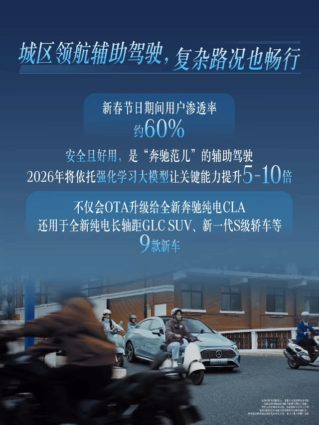 报告同时披露,2026年奔驰将以AI技术为核心,加速智能出行领域的双重升级。在智能辅助驾驶层面,基于强化学习大模型的迭代,城区及高速领航辅助驾驶的关键能力将提升5-10倍,主动安全系统也将完成功能升级并新增多项安全配置,进一步强化行车安全防护。