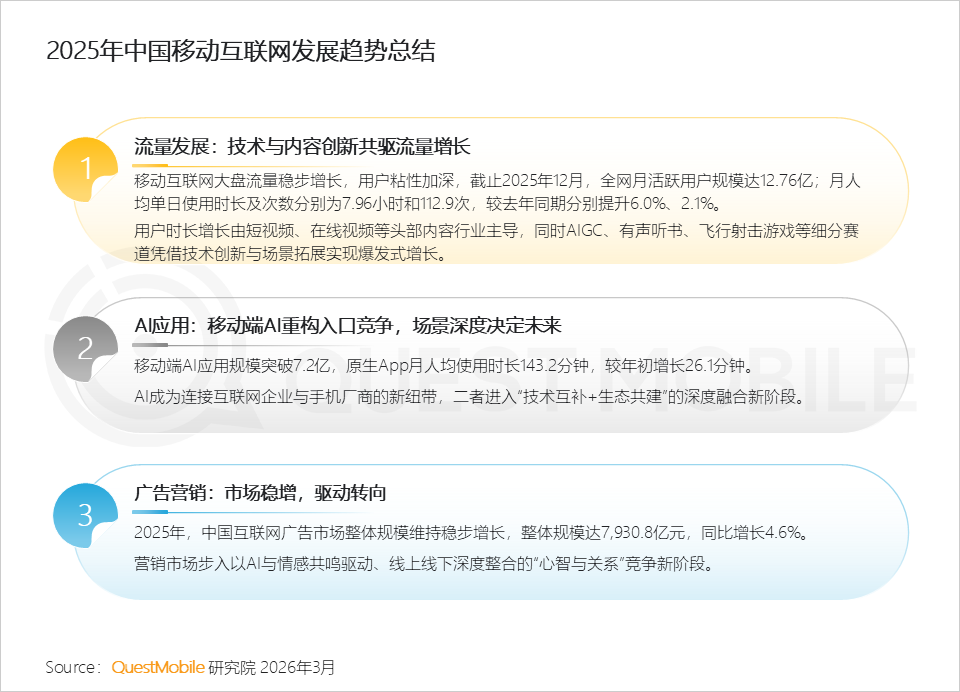 凤凰网科技讯 QuestMobile数据显示,截止2025年12月,移动互联网月活用户规模已达到12.76亿,同时,全网用户月人均单日使用时长及次数分别为7.96小时和112.9次,同比增长6%和2.1%。