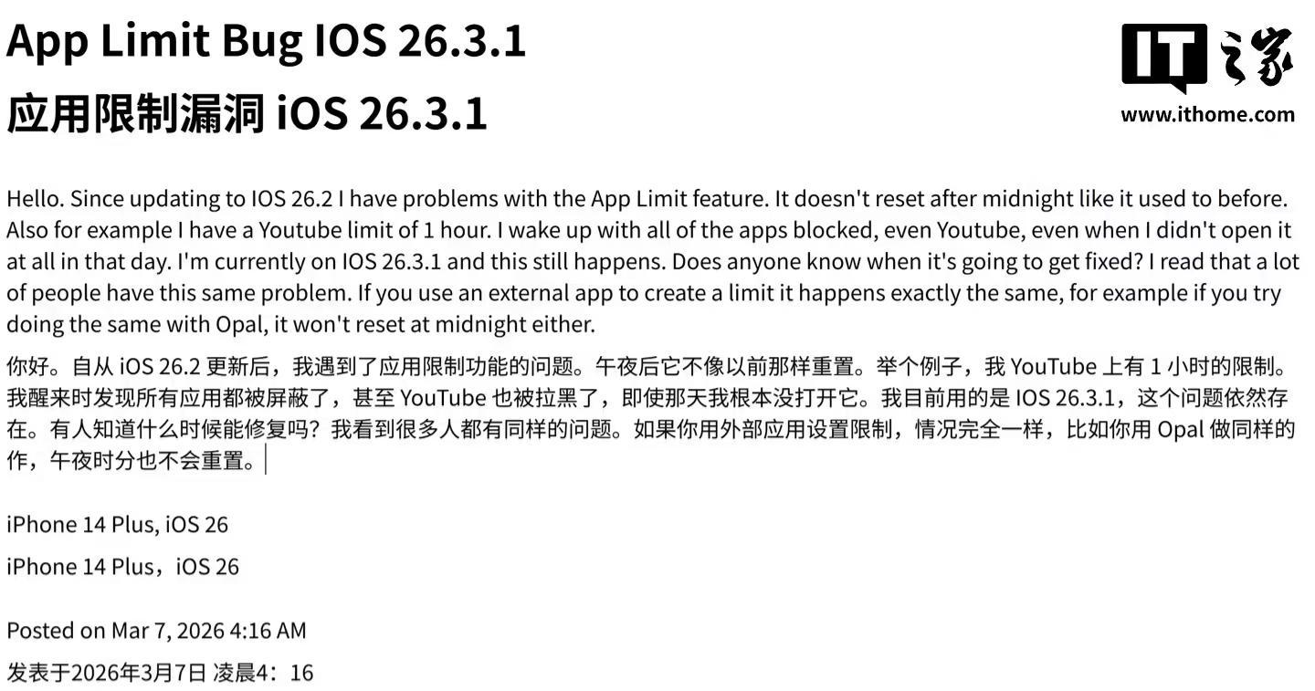 IT之家 3 月 10 日消息,科技媒体 Mac Observer 今天(3 月 10 日)发布博文,基于社区用户反馈,梳理了 iPhone 17 等用户升级 iOS 26.3.1 更新(3 月 5 日发布)后遇到的一些问题。