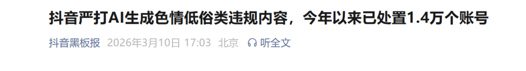 据@抖音黑板报,近期平台发现部分违规用户通过 AI 生成“单亲妈妈暧昧互动”“美女魅惑舞蹈”“着装暴露的海滨度假照”等低俗擦边内容,违反《抖音社区自律公约》平台规则,平台坚持从严从重处置。今年以来,针对AI生成色情低俗类违规,已处置4.2万条内容,对1.4万个账号处以限制推荐、禁言、封禁等不同梯度的处罚。