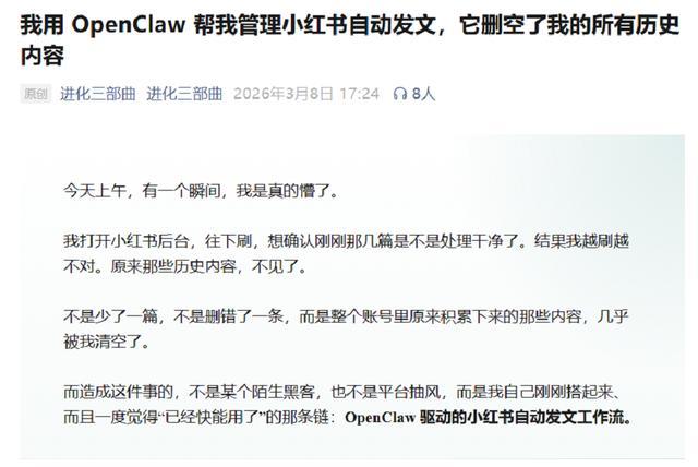 微信公众号“进化三部曲”的运营者则遇到了OpenClaw误删小红书帖子的问题。他打造的OpenClaw小红书自动发文工作流接入了真实生产账号,但在给出“删除内容”的指令时没有明确边界,最终所有帖子都被清空了。
