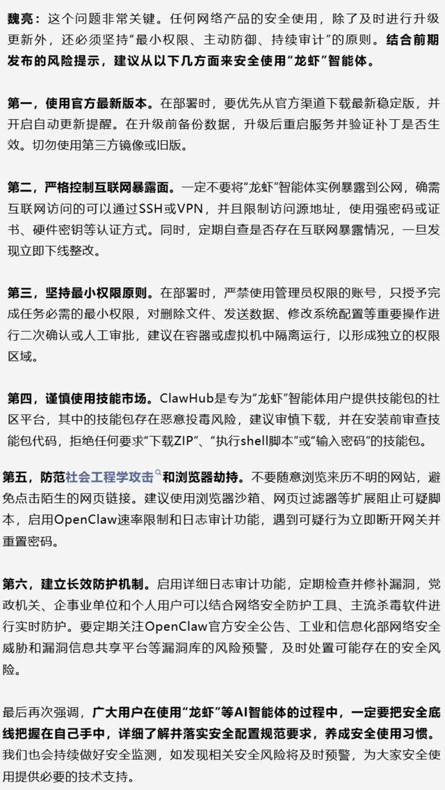 中国信息通信研究院副院长魏亮也在接受央视采访时给出六点建议,包括使用官方最新版本、严格控制互联网暴露面、坚持最小权限原则、谨慎使用技能市场、防范社会工程学攻击和浏览器劫持、建立长效防护机制等等。